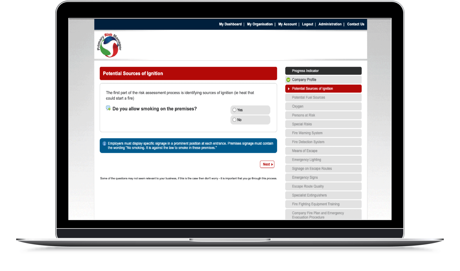Primary Risk Manager is an online Fire Risk Assessment which takes the hassle out of compliance and with over 10 years of experience the system is proven to meet the requirements of the Regulatory Reform (Fire Safety) Order 2005.